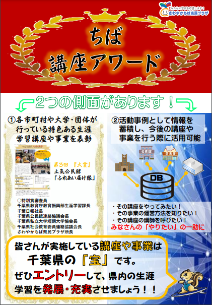 県内の各市町村や大学・団体の行っている、特色ある、地道な取組にスポットを当て、優れた生涯学習講座や事業を表彰します。「人生100年時代を豊かに生きる千葉県」の実現に向けた取組です。 そんな一粒の輝きを、多くの県民の皆様や団体の方々に知ってもらうことで、一層輝き、さらに広がっていくことを目指します。また、活動事例を蓄積することで、県内の生涯学習講座や事業のデータベースとします。
