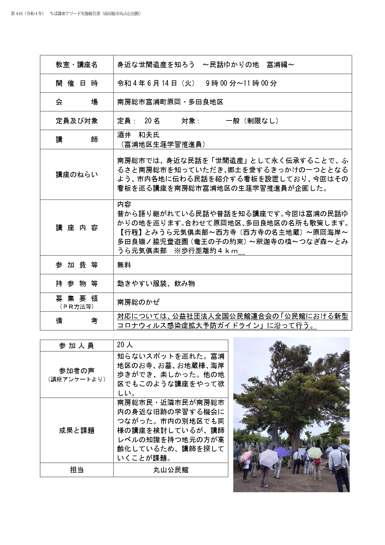 南房総市では、身近な民話を「世間遺産」として永く伝承することで、ふるさと南房総市を知っていただき、郷土を愛するきっかけの一つととなるよう、市内各地に伝わる民話を紹介する看板を設置しており、今回はその看板を巡る講座を南房総市富浦地区の生涯学習推進員が企画した。