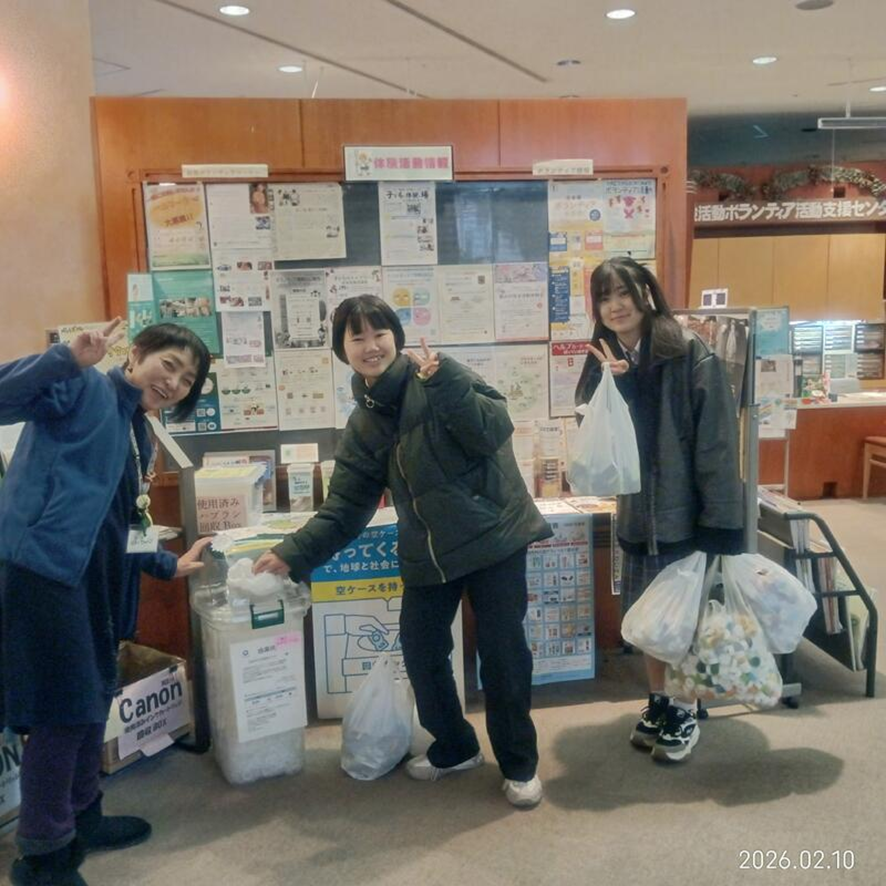 嬉しい訪問 2026年3月19日 12時00分 支援センターの収集ボランティアを参考に、松戸国際高校のユネスコ委員会の生徒たちが学校で呼びかけ、集まったものを持参してくれました。 嬉しい訪問に思わずピース。